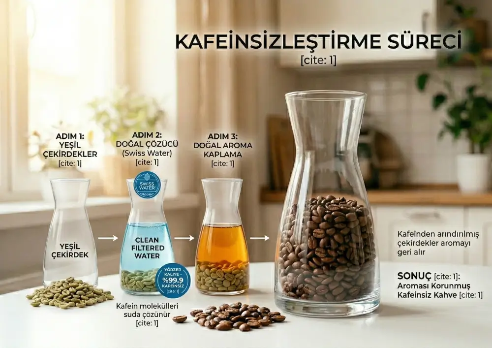 - Swiss Water Process (Su ile İşleme): Hiçbir kimyasal kullanılmaz. Çekirdekler sıcak suda bekletilir, kafein ve aromalar suya geçer. Ardından su, karbon filtreden geçirilerek kafeinden arındırılır ve aroma dolu su tekrar çekirdeklere geri yüklenir.